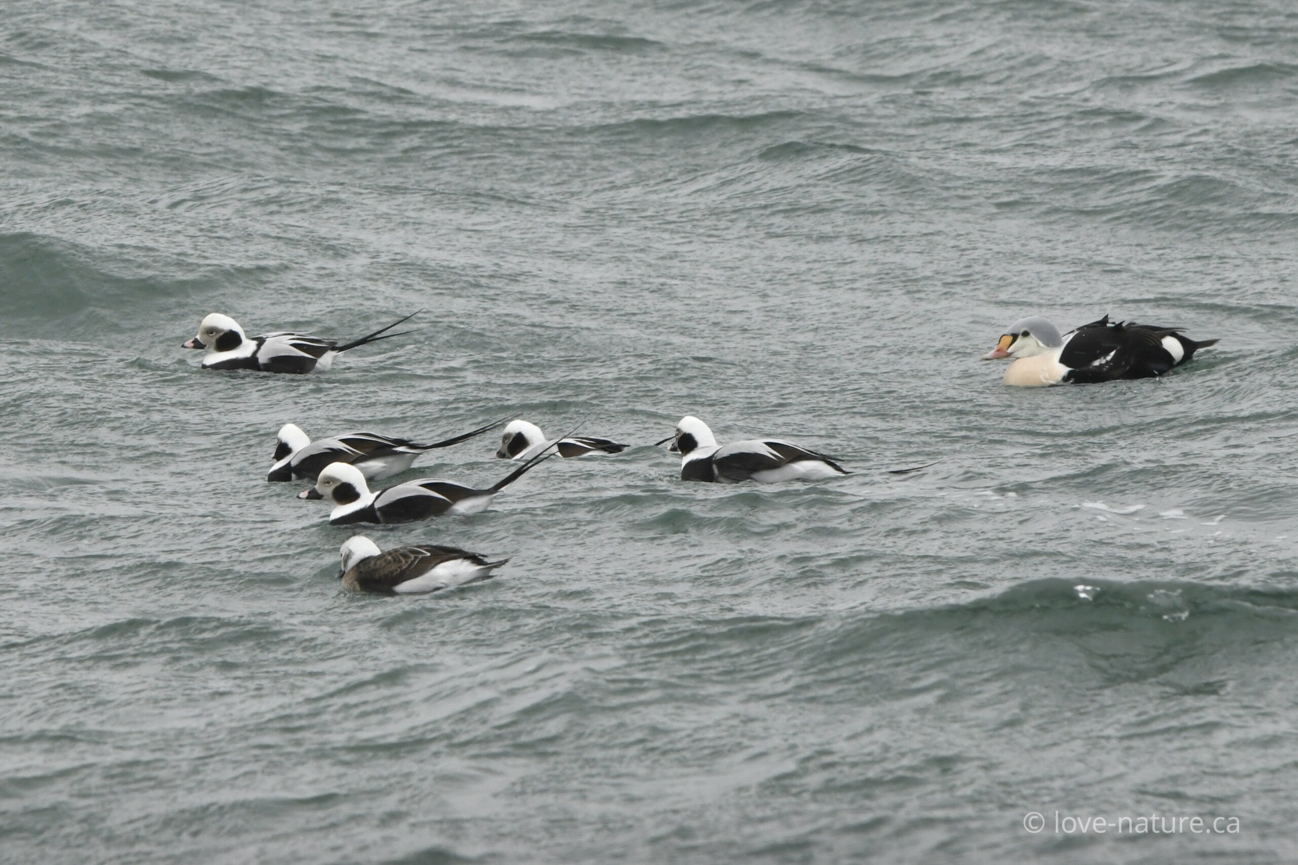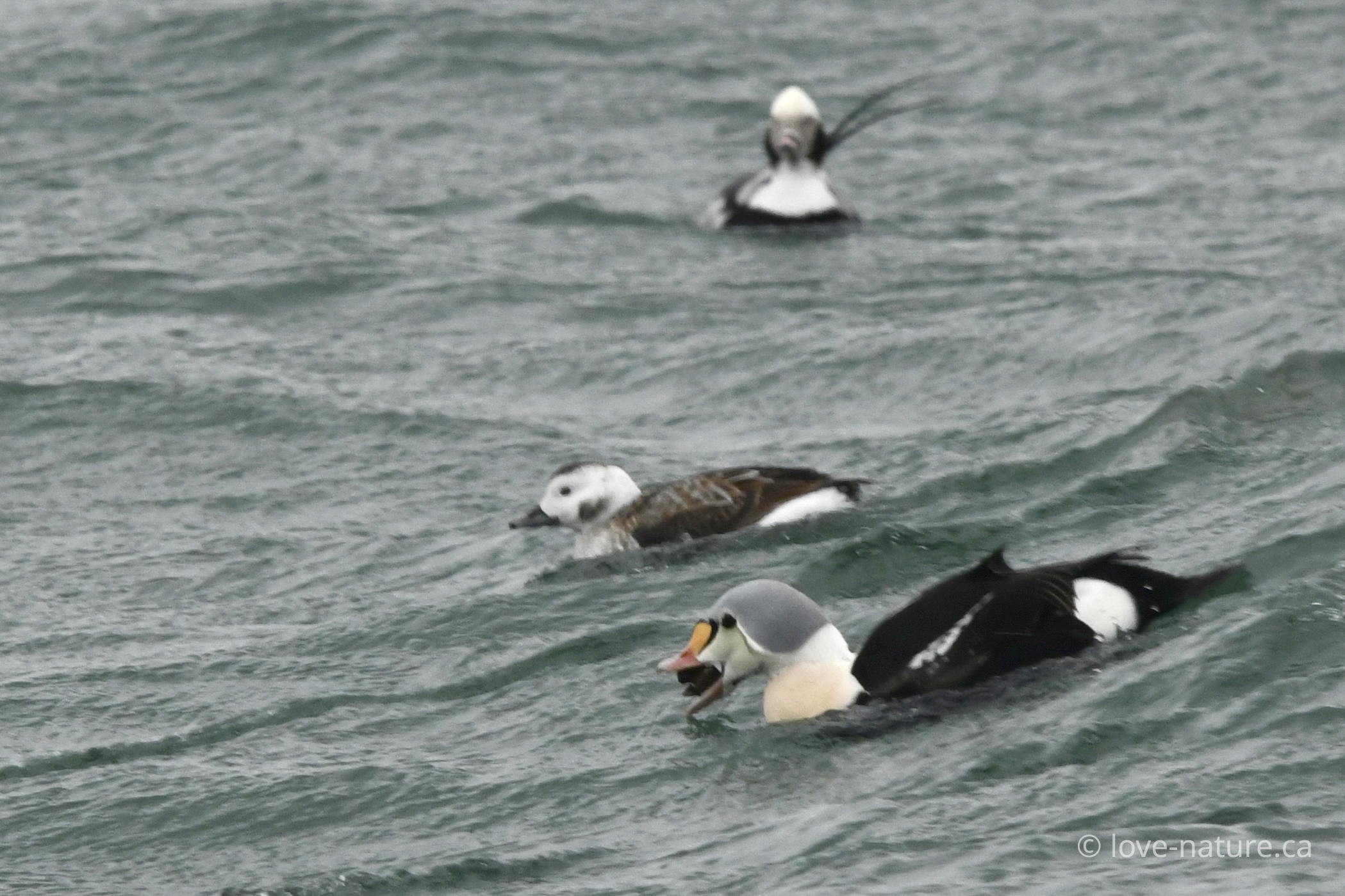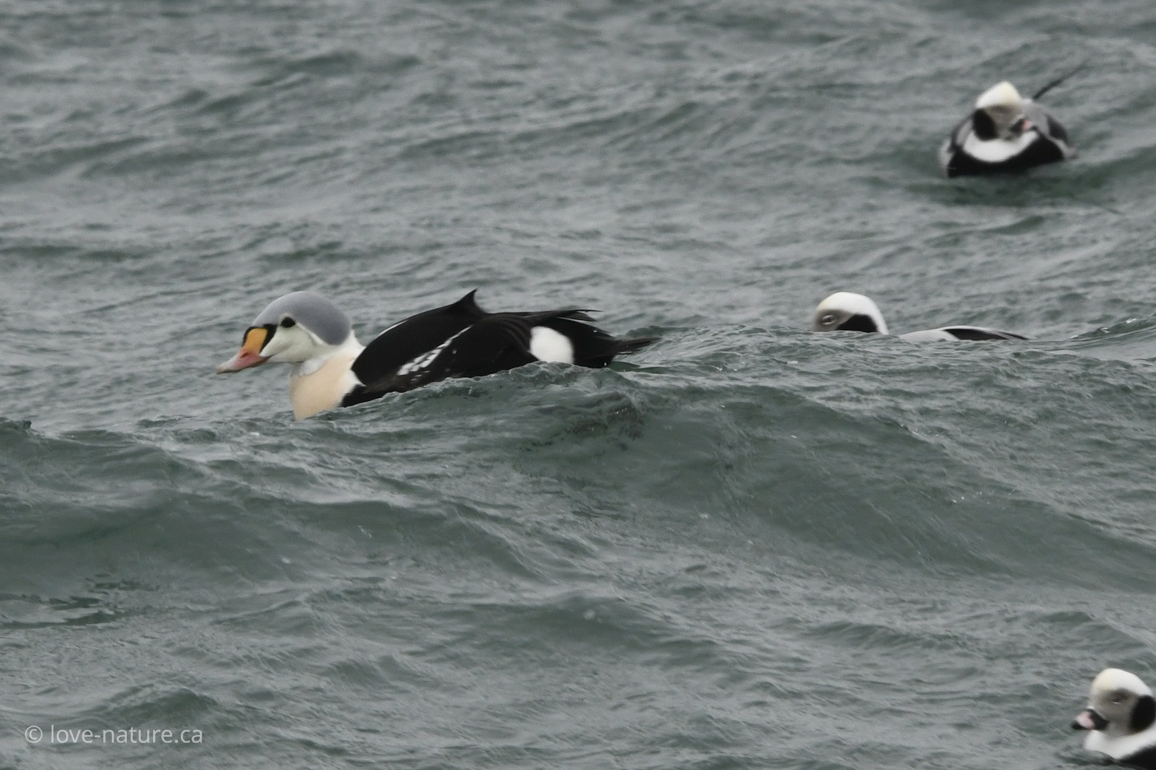 During the Toronto CBC day, I bumped into a member of the Toronto Ornithological Club who I spoke with along the trail where there were flocks of goldeneye and long-tailed ducks. He mentioned that a king eider had been spotted nearby recently. Interestingly, the king eider has been flocking with the long-tailed ducks in an area normally closed-off to the public, because it is a cormorant and breeding bird nesting space. Fortunately, at the exact time I also happened to visit an Ontario Field Ornithologists tour group led by ornithologist Mark Peck also happened to be visiting the site, so I had the chance to go into an area normally not accessible to the public and saw a king eider in Lake Ontario’s open waters.